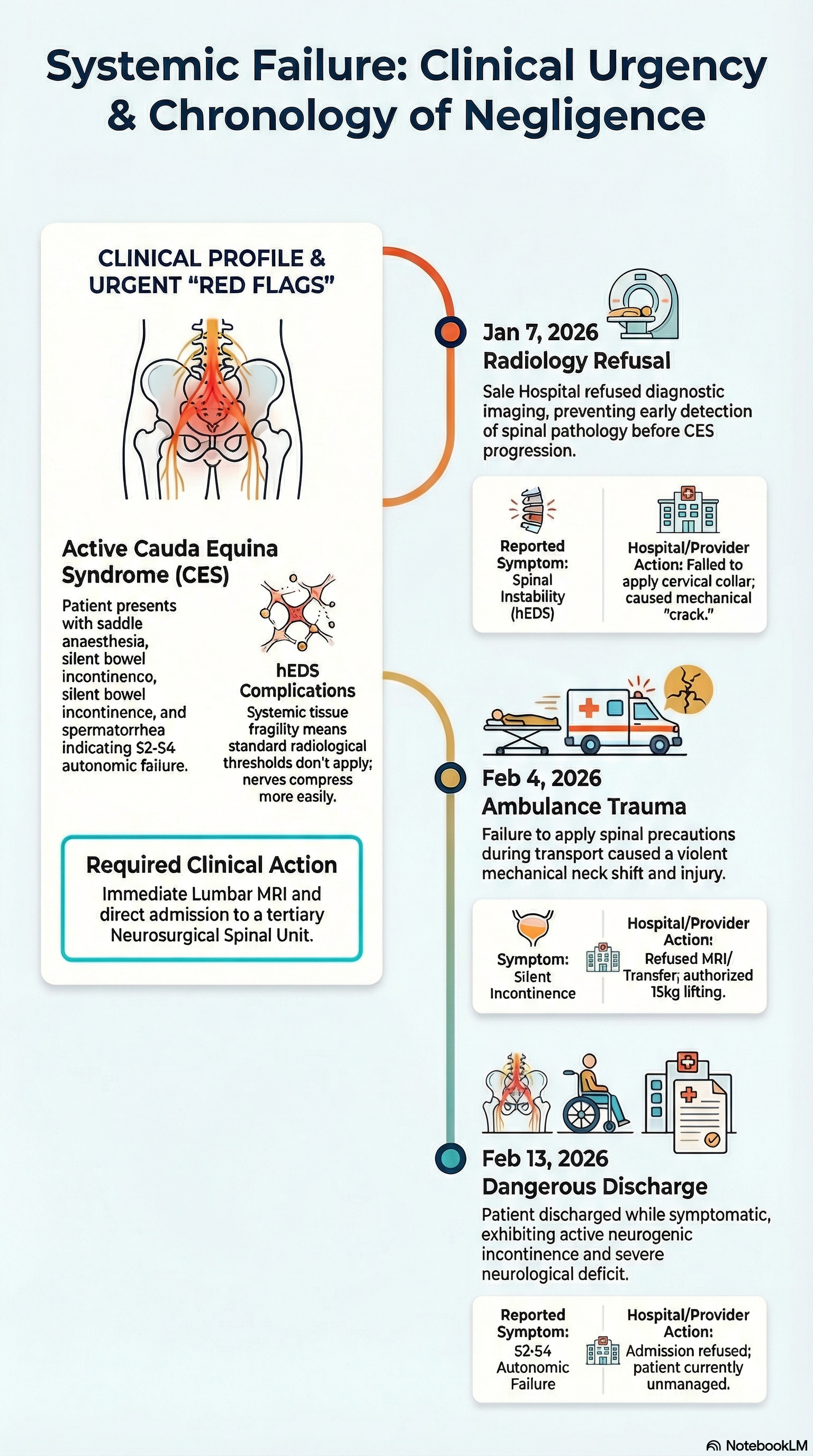 At the local emergency department, the failures compounded. I presented with suspected Cauda Equina Syndrome, leg weakness, and urinary retention [6]. I was forced to self-discharge after experiencing discriminatory bias and realising they would only offer a clinically inadequate CT scan rather than the required MRI [6]. Two days later, my autonomic failure progressed into definitive "red flag" territory when I suffered an episode of spermatorrhoea (involuntary seminal emission while flaccid and urinating), proving my S2-S4 autonomic nerve roots were actively failing due to compression [6].